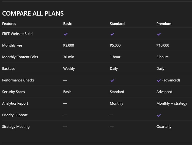 Every plan comes with a FREE 5-page website build when you commit to a 6-month maintenance agreement.